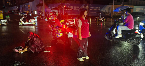2024年8月28日18时40分左右,陈飞山和肖金色在经过龙岗区岗头地铁站路口时,目睹了一起小汽车与电动自行车相撞的交通事故,电动自行车骑行者被撞后受伤倒地正处于马路中央。此时,正下着雨,且处于下班高峰期,道路上车流量大,十分危险。陈飞山和肖金色见状立马做好分工,上前组织开展应急处置。
