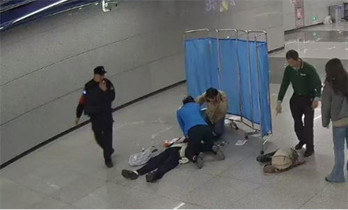 赶到现场后,姚攀发现该乘客晕倒在地无意识,只有微弱的呼吸,而且无法检测到心跳,同时还伴随着抽搐等状况,情况十分危急。姚攀当机立断,立刻俯身跪地对女乘客进行心肺复苏,并使用AED急救。在姚攀的急救措施下,该乘客原本苍白的脸色终于慢慢有了血色。